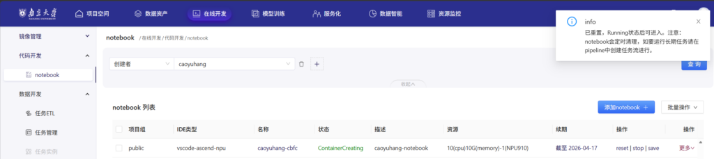 此处假设使用的是挂载8*NPU910的notebook。请使用纯净的notebook(即刚刚reset过),建议使用vscode-ascend-npu镜像。